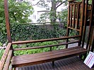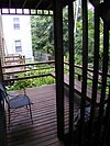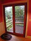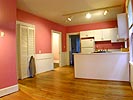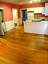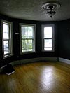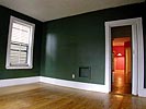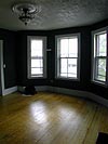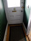 foyer and living room... the front door has an old fashion manual doorbell that you ring like you would a bicycle bell. two things in the living room i don't like: the textured plaster ceiling and the ceiling fixture light. both will likely be replaced. the kitchen seen from the living room has a nice contrast of red walls (actually dark pink, but looks red from a distance) against the green outside the backdoor. the color of the living room is currently too dark, making the living room appear smaller. i'll have to go with a lighter color. the living room gets the least sun because of its northern exposure, but from the bay window i can see down three different streets. but don't let the photos fool you, the living room really isn't that dark (the windows are overexposing the photos).