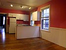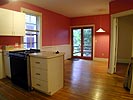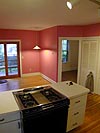 kitchen... pink walls? i'd like to go with another color. i'm very much a believer in color theory, how they trigger emotional responses, and i'd like the kitchen to be in food colors - red, orange, yellow, green - south of the border colors! i think the kitchen is the heart of this particular property, and it'd be a dream come true if i can get cable hookup in the kitchen, then i could hang out here all the time.