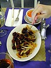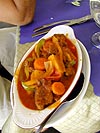 after wandering harvard square a little bit more, i headed into boston to meet up with dan at fenway 13 to get a ticket to tonight's movie, minority report. i was 10 minutes late to the theatre, but no harm no foul. we walked to buteco (130 jersey street), that little hidden brazilian restaurant in boston. the first and last time we ate here, i had some bad reaction to my dinner. we were joined momentarily by eric beacom on his bicycle. the three of us ordered without joel, who arrived when we were eating our main course. his roommate darren came soon afterwards. i had the beef stew, which sort of resembled curry in the way it's eaten, pouring this meat dish on top of my rice and black beans.