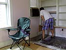 walking from porter to my cambridge home in the blistering heat (although the weather was hot, the view was hotter), i ran into my father, also on his way over to the place. he had an old air conditioner in the back of the explorer that he and i installed in the master bedroom as a temporarily solution to this oppressive heat wave. we did some work around the house, i pulled out some nails from the floorboards, unscrewed some screws from the walls, took down the mismatched medicine cabinet from the bathroom, and did an inventory on my ibook of things to fix for the contractor, printing out a copy and leaving it outside the front door for him to pick up. we also staked the hydrangeas, and my father watered the garden a little bit.