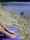 we took route 2 to walden pond, where already it was starting to get crowded, people coming early to grab a parking spot. get to walden pond earlier enough and you don't have to pay the "donation" aka parking fee since the guard isn't on duty yet, which was exactly what happened this morning. julie pulled her car into a shady spot and we walked around the perimeter of the pond looking for a good place to settle down. walden pond today was a lot different than when we came last year. due to this season's drought, the water level was very low and the pond was edged with exposed beaches, beaches that weren't there before. this was good news for us because instead of huddling along stone steps, jostling for positions, we had the whole perimeter of the pond to enjoy. we found a sunny spot, dropped our stuff, and julie quickly took off her clothes and jumped into the water in her bathing suit. i was more deliberate, more hesitant, as removed t-shirt and shoes and slowly edged into the water. cold! but it wasn't really, once i submerged to my neck, the water was perfect. julie had a theory that guys had a harder time adjusting to the cold, which included ponds and showers, because of our boys. and girls feel cold more often because of those things.