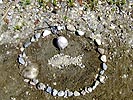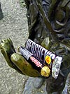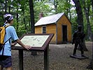 coming out of the woods and back to the parking lot, we visited the thoreau shack which included a life-sized bronze statue of thoreau. i don't know who told me this (dan paquin?) but i heard that thoreau actually wasn't that self-sufficient, and when he left his shack during the way, his butler would come to his place, clean everything up, and leave food for him. i told julie this revelation and she wanted to find out for herself. the display outside the thoreau shack naturally said nothing about his secret manservant.