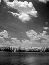 on such a sunny day it was perfect condition for infrared photography, with the pond and the sky and the white clouds. when we were first there, there was hardly any clouds, and the air was amazingly still, hardly a breeze. later, more and more white puffy clouds started rolling in, which julie told me were signs that a possible thunderstorm might be heading our way if the clouds got any bigger.