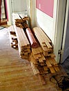 midway through my stripping, the wood guy came to my house, delivering bundles of wooden planks that'll be used to line the floors of my two bedrooms tomorrow morning. it's pretty exciting, new floors! at one point wood guy asked me what i was doing with the window, and i explained to him about chemical strippers. i think i used the word "nasty" somewhere in the explanation.