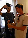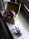 erin's housewarming gift finally arrived today, a cast iron cricket figurine, which will look good with my cast iron bee/cicada votive holder. the mailman tried to slip it through my mailslot but it wouldn't fit, so he eventually rang the doorbell to let me know of my package. mark hickey and his friend anthony showed up at my place to check it out, guest number 14 and 15. while my father was busy stripping the windows, i gave them the tour, culminating in the basement where i showed mark the screen house foosball table, perhaps one of the more important relics from screen house past, something only someone like him could fully appreciate, having tasted so much blood of vanquished enemies upon that very table.