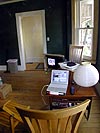 so, just like that, murphy's law comes into play and the hopes of proper interior illumination will have to wait yet another day. my father and i then spent a few good hours cleaning up the place, vacuuming dust from the floors and mopping down the hardwood to get rid of drywall compound splotches left as inadvertent gifts by the general contractors. of course we couldn't have done any of that work without first installing the air conditioner in the living room.