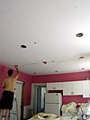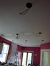 i ended up deciding to go with a single light by the door instead of two. once that was all set, he put up these 5" diameter red template stickers on the ceiling, and then he carefully cut around them, making holes for the lights. next he started snaking the wires through the walls, clumps of old insulation (chewed up paper pulp that was probably pumped into the house when they did the ceiling) falling out of the holes like grey snow. when he was finally done, the ceiling was dotted with strands of electrical wires hanging from each hole.