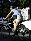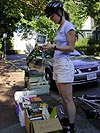where people were out enjoying the weather on the grassy bank of the river, sunbathers, volleyballers, boaters. from there we headed back to my place in cambridge, returning to the site of the free books. i grabbed a book on raising rabbits, clipped it to the back of my bike, but the book later fell off without me realizing it until i got back home and saw that it was missing. eliza attached her bike to the rear trunk bike rack of her car and drove off.