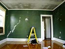 climb the ladder, and starting painting the area below the ceiling trims, working my way around the perimeter of the room, wiping off any paint that gets on the trims; finally, paint the remaining top half of all the corners and windows and doors. all that and i'm still not done! done with the wall painting, yes, but the room still needs to have all its trims painted, and i need to tape for that (yeah, i'm going to go with taping, it's a little bit of work to tape around, but it makes detail painting so much easier).