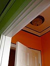 020619 original living room popcorn ceiling old light fixture dark green walls |