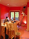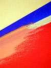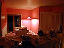 finally i finished the bathroom, and moved on to the kitchen, where my father was still edging. i climbed on the ladder and did some ceiling work, but it was just too tedious. finally i decided to do what i did for the other rooms, which is to tape the ceiling. the only downside to that is when i remove the tape, it might rip some of the paint off, but it's a small price to pay for not having to carefully trace the edges of the ceiling. with the ceiling perimeter of the kitchen taped, i was able to very quickly paint the edges in under 30 minutes, following my father as he applied big rollstrokes of pink onto the walls, covering up the previous salsa color. i missed salsa increasingly more as we started to cover it up. i had an idea of maybe horizontally stripping the kitchen walls with alternating bands of autumn red (pink) and salsa (red). i've seen it on trading spaces, so i know it can be done! i'm just trying to find creative ways to use my 2 gallons worth of salsa paint that i bought.