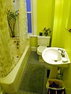back at the house with a suv load of stuff, i unpacked and started detaping the bathroom, revealing nicely painted walls. my father and i put the tank back onto the toilet (oh wonderous flushing mechanism, how i've missed you so!) and reinstalled the large bathroom mirror. after adding some plants (Dracaena sanderana aka lucky bamboo, spider plant, roses), the bathroom looks very finished now.