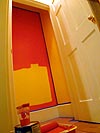i kind of like it this way, the foyer all orange, the inside of the closet flanked by two yellow walls then a red wall. the double coloring definitely adds depth to the small closet, my sister was right. it would've been a shame to completely lose the yellow in the closet, my original color choice. this way, i can have the best of both worlds, keeping the yellow, yet at the same time introducing the salsa red that i love so much but can't bear to use in the kitchen.