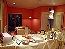together we painted the second coat of autumn red in the kitchen, she worked the roller, i edged with the brush and multiple up and downs on the stepladder. this end of daylight saving's time kind of puts a weird twist on my painting schedule because i'm used to painting only during daylight hours, but now it gets dark much earlier, and we painted to 6:30pm, the sun having set hours ago. i didn't even really notice, i was too engrossed in just trying to finish my part of the painting. taping the ceiling idea definitely helps. if i was to paint the ceiling edges freehand, it would've taken me 3 backbreaking hours just to do it, and it wouldn't be a very clean job. my sister and i discussed my concept of maybe striping the kitchen walls with horizontal bands of salsa red. she didn't care much for the idea.