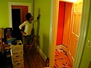 while she was leaving, i started preparing the coat closet for salsa red. my sister told me to paint just one wall of the closet, when i wanted to paint the whole thing red.