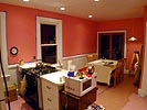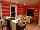 with the kitchen pretty much done except for the shuttered folding door of the washer/dryer cabinet, i pulled up more than half of the rosen paper that'd been on the kitchen floor for the longest time. one thing i didn't realize is how shiny the floor is, and how it reflect the 10 spots of recessed lighting on the ceiling above.