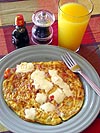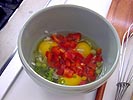 i started what's left of my day by making an omelette: 3 eggs, chopped onions, chopped red peppers, chives, slices of ham.