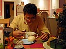 we didn't add any salt because the stock and the soy sauce were already salty enough, and neither did we put in any msg even though my father brought some over. once the soup started to boil, in went the sugar (to add an extra dimension to the flavoring, and to counteract the vinegar) and the vinegar, followed by several tablespoons of cornstarch mixed with water. last but not least went in a few battered eggs, dripped and mixed into the pot so as to create strands. we seasoned with some coriander and chives. we didn't have a few ingredients (chinese mushrooms, strips of pork, tofu cubes) but the soup came out fine anyway. the beauty of hot and sour soup is in it's layering of the various ingredients.