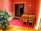 the color is predominantly red, but a kind darkish red. i'd much rather prefer a brighter red if it's going to cover a large space in the living room. a lot of smaller area rugs patched together makes or a more interesting composition and better options versus a single large rug. my father also helped me rearrange the position of the larger new red area rug in the dining area. last night i had it lengthwise in the direction of the kitchen but it looked very out of place. tonight it put it widthwise across the kitchen, and it looks a lot better, a more logical arrangement.