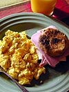this morning was nothing special, 3 scrambled eggs plus a toasted raisin english muffin stuffed with ham and cheese, with a glass of orange juice. i felt so stuffed after i finished eating. some people say food tastes better when you make it yourself, but i don't really notice the difference. for me, it's more of a sense of personal accomplishment. i'm definitely not at that stage yet when i can say i love cooking, nor do i think that's something that will definitely happen. i could just as easily discover that i hate cooking, and spend the rest of my life eating out, cooking only out of necessity. it's still early in the game though, although i will admit that cooking right now for me is sort of an amateurish fumble, but like i said, i've only just started, and the fact that i keep on doing it even when i have cooking failures show that at least my heart's in the right place.