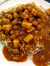 for lunch i cooked up some ready-made alu chole, curried garbanzos & potatoes served over brown rice. it essentially involves boiling packets of food in water and then serve. for something so seemingly processed (although the box touts all natural vegetarian ingredients), it actually tasted pretty good. easy to make and tastes good, that's my kind of good.