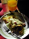 for brunch, i made an onion with a little bit of omelette. i had half an old onion that had some fuzz on it (must've been in my fridge for weeks). i sliced off the moldy end and chopped up the rest of the onion, while i had two eggs (with some milk) cooking over the stove. once again i had a hard time flipping my omelette, so i just dumped the rest of the ingredients into the pan (onions, scallions, ham) and folded the omelette in half. the resulting creation, served with a cup of mango juice, left a burning feeling in the pit of my stomach because of all that raw onion.