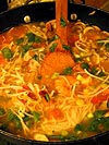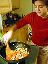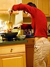 dinner came in the form of a trip to julie's apartment in davis square, the occasion was to pay me back for the week's worth of internet access usage. when i got there she was in the midst of making thai (or was it vietnamese?) spring rolls, with a pan of peanut sauce simmering on the stove.