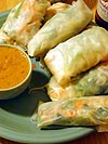 her roommate kim was home, with whom i assumed was her boyfriend. they made occasional cameos in the kitchen, ordering out instead of joining us for dinner. kim was scouring through the stacks of local take-out menus. julie and i went into the living room to watch west wing, where kim's boyfriend joined us briefly, delighting us with his celebrity knowledge. rob lowe was conspicuously absent from the show except for a few compaign posters hanging on the walls with his photo on it. after that came law & order. from the corner of my eye i noticed a towel wrapped kim running quickly into the bathroom to take a shower. julie revealed that she thinks billy bob thorton is hot (i think he's gross). when law & order was over, i left julie's place, but not before taking two spring rolls in a doggie tupperware and some peanut sauce in a ziploc baggie.