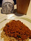 for lunch i had channa dal masala with yellow lentils with a glass of daily fruit elixir (peaches, grapes, strawberries, tropical fruit juice, yogurt). since living on my own, i've never had so much fruit in my diet. granted, it's all mushed up into a pulpy yet tasty slush, but i'm still getting all that fruity goodness. i got a chance to use my timer for the very first time, the instructions called for 5 minutes of boiling, i set the timer, and went into the living room to watch tv, before i heard the ringing tell me my 5 minutes were up. no more spotty science of minute counting in my head! i don't not have an atomic time piece in my skull, but now thanks to the handy cooking timer, my timekeeping will be accurate.