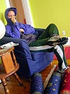 how that number entered my head i'm not sure, i think i might've mistakenly applied the "no swimming after eating" rule to running as well. i noticed my next door neighbor jeff had slipped a christmas card into my mail slot this morning, a b&w photo of a young iron-clad anthony quinn on the cover (a scene from la strada, 1954), the picture's subtle allusion to the holiday season completely lost on me. close to noon eliza called, apologizing profusely and saying how she was just leaving jamaica plains. like i'm going to get angry if a young woman comes late! 20 minutes later my doorbell rang, eliza arrived with a large backpack, which i assumed (incorrectly) was her change of clothes.