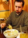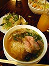 first making a quick stop at the newly renovated fleet bank to cash in two of my latest unemployment checks (they're coming every week now since i've been on the extension, before it was every two weeks). i had a small bowl of pho with a glass of jasmine ice tea lemonade while dan had the vermicelli with spring rolls. when he wasn't talking about his recent trip to brazil, his new job, or the new card game he bought, dan was informing me of how much trouble i'd gotten him because i mentioned the fact that he recently got married.
