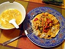 for most of the evening amy and i hung out in the kitchen. i assembled all the ingredients, did the dishes, then started on the soup. i had forgot to ask amy beforehand if there was any food she didn't eat. "beef and pork," was her reply. gasp! by sheer good luck, the two things i was making tonight were both primarily chicken based. amy helped with chopping the garlic and the ginger. when the soup was done, i started cooking the rice and made the thai curry, amy once again helping with the chopping duty. i burnt the garlic bits before i had the chicken cubes ready, so i had to dump out the burnt pieces and start afresh (2nd time around, much better results). my thoughts on tonight's dinner: the thai curry was pretty good despite the fact that i made too little rice to accompany the curry. it's an easy recipe to make, just a lot of ingredients to keep track of and when to add them into the pot, but a successful dish. the soup however wasn't as tasty, both amy and i had leftovers, probably needed a little more spicing up.