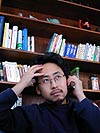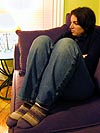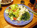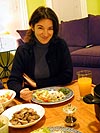 in the evening, renata dropped by after her class to hang out but it became a dinner when i heard she hadn't eaten yet (so haven't i). i had all the necessary ingredients to make a raisin and nut pilaf, with some side dishes my mother had left behind (a piece of pork chop and a container of seaweed salad). despite telling her not to bring anything, renata once again brought over some materials for making a salad. she was also happy to inform me that tonight she was super-layered with clothes because she knew how i like to keep my place really cold. it wasn't necessary, because 30 minutes before she arrived, i'd jacked the heat up to a blistering 68 degrees (sarcasm). because it was kind of late and i was pretty hungry (i'm sure renata was too), there was no time for idle chitchat and it was straight to the kitchen to make dinner. while i assembled the pilaf, renata was creating the salad, which seems to be one of her special skills. i also told renata that today was my special day, and she was incredulous that i didn't tell her before she came. our conversations also touched up michael jackson (he's the topic du jour for many people these days) and she got me to admit that i like aliens (specifically, in the form of t'pol, vulcan science officer on enterprise).