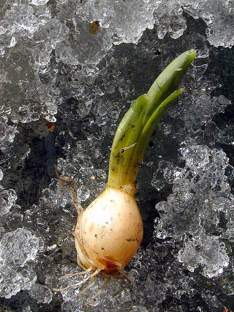 the warm weather accelerated the snowmelt in the backyard, revealing bulb activities, spring signs. i saw bulbs poking out of the ice, soon to flower, and even a few washed free from the dirt by the eroding snow. the only flower out there was a single snowdrop (galanthus), pretty with its drooping white petals. i've yet to see the backyard during the spring (since i purchased the place during the summer), so it'll be a sequence of perennial surprises waiting me for the next few months.