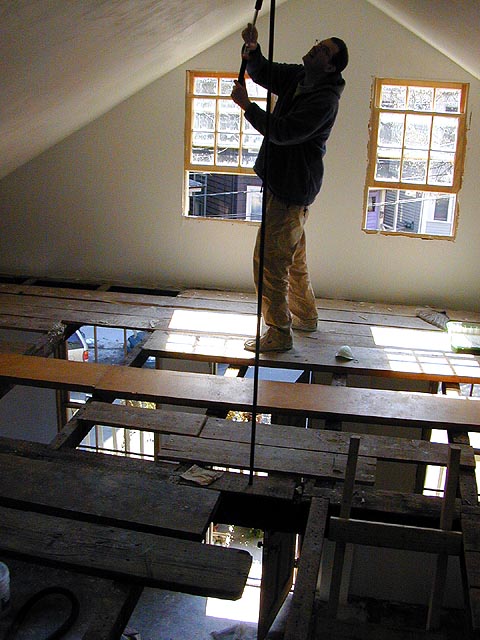 i also helped him put up some more planks into the beams of the second floor. jeff showed up eventually, along with some guys who were there to install the central air system in his house. bruce and i climbed on the beams and sanded the ceiling (wearing a mask that fogged up my glasses), before we started priming, white on white walls. i am a favorite anecdote of the few who've helped me paint my own place, because i had them prime white walls. they didn't understand that the primer acts as a sealant and helps the paint to grip to the walls. however, today i was working with guys who had no qualms about white on white painting. finally, people who understand! also, guys who can understand that walking around with paint on your hands and face is quite sexy.