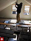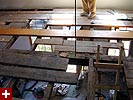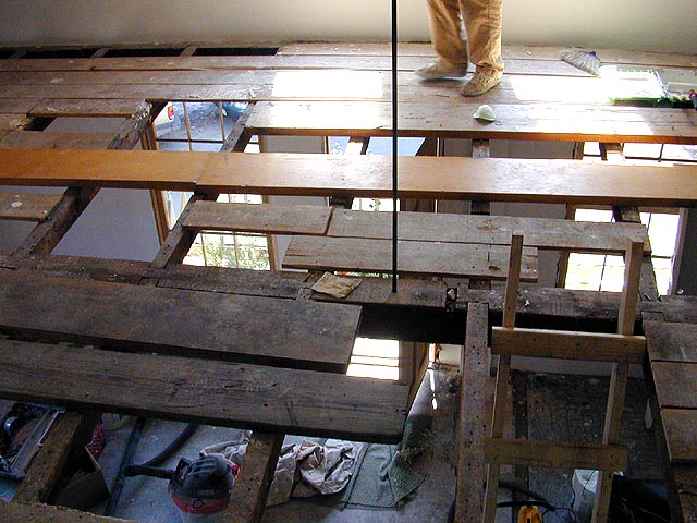 painting on the beams was very difficult. hard enough trying to paint sloped ceilings, but walking on planks laid across ceiling beams, and some of those planks not even nailed down, and being careful where to step lest i fall to my death. parts of the ceiling required that i crawl on my stomach, my legs dangling from either side of a beam, splinters digging into my arms, in order for me to paint it. by the lunchtime break, i had paint in my hair, on my face, and all over my clothes, not to mention all the plaster dust from the sanding earlier. i went home, heated up some leftover rice noodles, read some e-mails, watched some more war coverage, then went back to work.