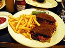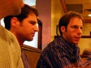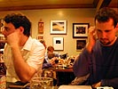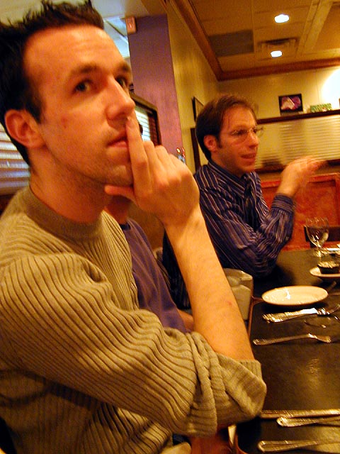 john's brother tom (the organizer of tonight's events), and john himself greeted dan and i. later, john's holy cross friend john arrived as well. we waited for the remaining guests to show up, but decided to order without them when it seemed they wouldn't make it in time. i ordered the reuben sandwich, corn beef with sauerkraut on rye bread, nothing spectacular, i've had it before, better than the youngman i had yesterday though. by the time we were done with eating, the rest of john's friends showed up (some coming as far as new york city, same as john). those that ate paid the bill, and then we all went across the street to the coolide corner theatre, brian sheltering me from the rain with his oversized umbrella and convincing me pants can never be too tight.