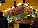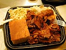 blue ribbon BBQ looked like a pizza place, a few tables and a row of stools along a front window counter, definitely not a restaurant. the place is loosely decorated with a southern decor (old license plates, a photo of elvis), with framed chalkboard menus hanging from the ceiling. i got the duo platter with texas sliced beef brisket and a piece of red hot smoked sausage, while julie got the duo pulled pork and memphis dry-rubbed barbecued ribs. julie said it was better than red bones, and asked me to rate the barbecue food there. "8? 9?" she inquired. "hmm...more like a 7," i replied. she said i was too picky about my food. there was just way too much meat, and i ended up taking most of it home in a doggy bag.