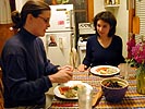 after dinner, we relaxed with some tea, amy going to her car to get some leftover cookies and her latest piece of shtickle, a magnetic tackboard. amy wanted to give it to renata, but i ended up getting it because renata didn't have space for it. the girls made fun of me because i like my sugar with some tea, pouring in another tablespoon when renata was busy changing the cd (mob's greatest hits).