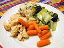 dinner was cooked chicken breast, carrots, bokchoi, and something that renata called "smashed" potatoes. there was also a bowl of salad heavy on olives.