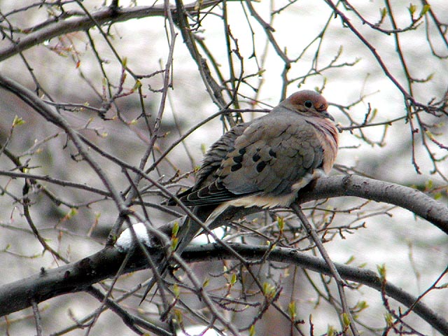 my sister drove me back to belmont, where my father and i helped her switch her futon mattress, then i drove back to cambridge. in the park i saw a woman playing with her keeshond in the snow, and made me nostalgic. keeshonden are the best dogs in the world, no other breed of dogs can ever compare. from my backyard i saw a mourning dove, the same one i had seen sunday afternoon (which leads me to believe that it actually lives somewhere nearby). it was sleeping on some branches. i find a lot of animals sleeping in my backyard for some reason. most of the time its squirrels, who after filling themselves with acorns, often time bask in the sun on the deck railings or the fence tops and take a nap, but occasionally i find birds sleeping in the backyard as well.
