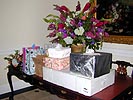 others reluctantly dragged out) as she tossed a clutch of flowers over behind her head. also around this time dan did me and favor and helped me get my crate & barrel gift out of the car (box slightly wet in the corner from the rain earlier) and put it on the gift table. even though my present wasn't wrapped, i was happy to see that it was the BIGGEST present out of all the other guest brought presents on that table.