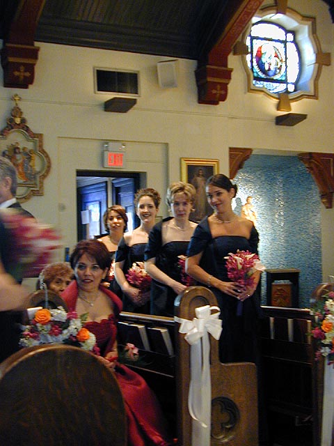the ceremony started with the parents and grandparents walking out first, followed by the best man (john's brother tom) and the groom, then the bridesmaids accompanied by the groomsmen. i was surprised that the bridesmaids wore black, but this is long island. megan, one of the brisdesmaids, saw dan, cymara, and i and waved (we waved back cautiously, not thinking that one of the bridesmaids would actually be waving at us!). up and in the back of the church, live musicians played from where the organ player would normally sit. finally, walking down the aisle, the father of the bride came with the bride herself. i actually got a little bit choked up when deanna's father presented her, it was such a bittersweet moment, an intensely happy occasion, the marriage of a daughter, yet at the same time a sad occasion as it was also the loss of a daughter as she became somebody's wife. john and deanna walked up the altar and sat down on a bench as the priest gave the catholic service.
