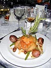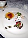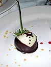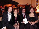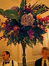 john and deanna had the first dance (the song, of course, was some frank sinatra tune, performed by a live band), the room erupting in flashbulbs as people captured this kodak moment. we were all placed at the same table, the boston contingency of the room (other than erin, whom i've met from last summer's hampton trip). a tall floral arrangement was the centerpiece. on the table were also gifts for the guests, heart-shaped metal winestoppers. we passed the obligatory disposable camera on the table around, taking photos of one another.