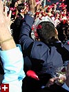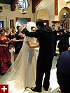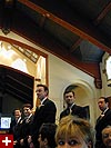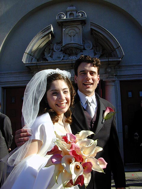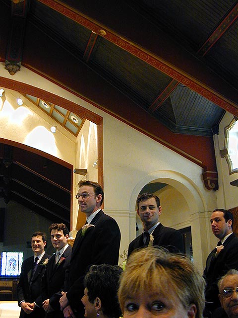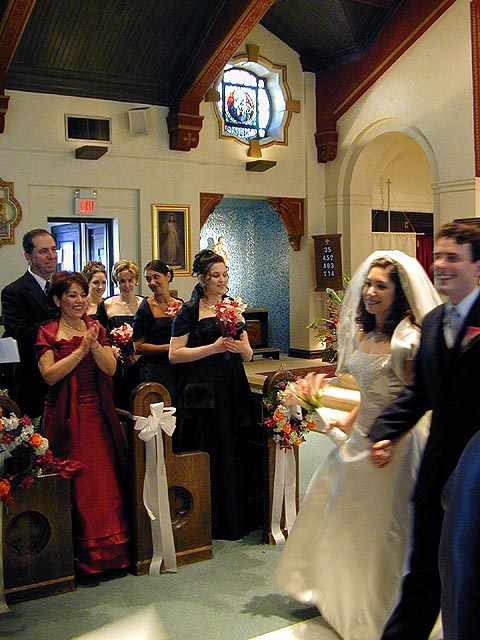 with the obligatory shake-hands-with-your-neighbor "peace me onto you" business. fortunately dan appeared to be just as clueless as to the going-ons as i was, and we basically sat there while all around us everyone (including cymara, john sanzi, and his friend ernie) seemed to know what to do, how to act, what to say, like we were privy to some secret society. when the service was over, the bride and groom marched out of service chamber, followed by the bridesmaids, groomsmen, and family. as the guests walked out, we got an opportunity to congratulate the family and the happy couple waiting for us by the doorway. i met deanna's parents for the first time, her mother knew me as the "weblog guy."