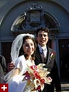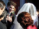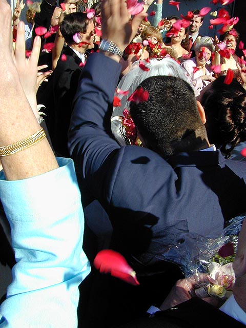 everyone waited outside for john and deanna to walk out of the church. we hooked up with former coworker eric and his wife csilla. eric was dressed in a fancy tuxedo versus the plain black business suit dan and i both wore. the photographer directed the crowd as to where to stand seconds before the happy couple came out under a shower of guest thrown rose petals. after some mingling, the happy couple escaped inside of what appeared to be a white bentley,
