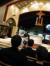 a funny thing happened when we got to manhasset: the weather suddenly cleared up. i should've believed dan "cloud-whisper" kuehner when he told me it'd be nice weather once we got to new york. what had been serious rain clouds earlier during the day now cleared away exposing a beautiful blue sky on a warm spring day. i had hoped it'd keep on raining so i could caption the day, "the monsoon wedding." we drove to the church, found a place to park, then went inside. we saw a few familiar faces here and there, but we were definitely the minority. john came out to greet us, as more and more people started arriving inside the church of st.mary. we saw john's parents and i met his mother for the very first time.