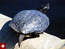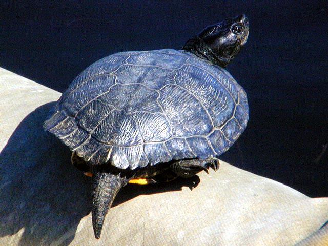 you ever expect to see an animal of a certain size and then when you see one that's many times larger, it's kind of scary? well, that's what happened. someone this large turtle had climbed on top of one of the floating barriers and was basking in the sun as well.