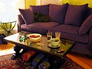 later, after work, my father dropped by briefly to deliver a long coffee table that'd been sitting in the basement of the cafe. an antique affair, with a removeable glass countertop, it seems to fit in well with the couch (about the same height off the floor, good for putting your feet on), plus it's free, so i can't complain.