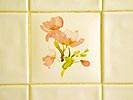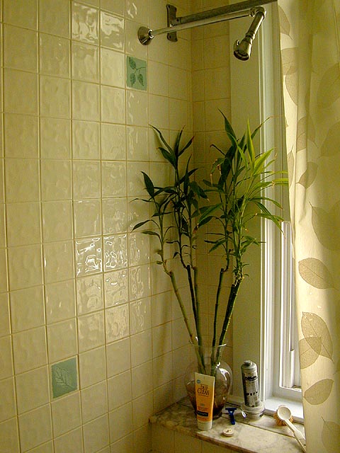 one thing that never seemed to fit are the several pieces of tiles that feature pink watercolored flowers. today i did something about them. my sister gave me these waterproof self-adhesive stickers that seem to be designed to stick on tiles, green squares with leaf patterns on them. i covered up the pink flowers, now the total immersion leaf effect is complete! i felt very martha stewart. while i was at it, i also cleaned the bathroom, tilex clorox the works. i have place line of thinking that if i can keep the bathroom clean, the rest of the house will match it in cleaniness, since bathrooms are usually the dirtiest part of the house.